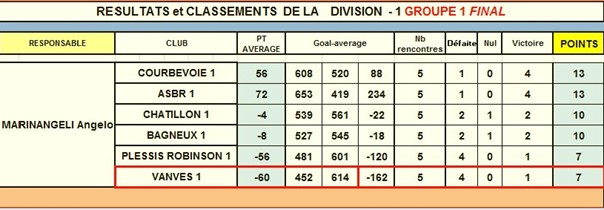 VANVES est en 1ère division et est dernier de son groupe et passe donc en 2ème division en 2014.