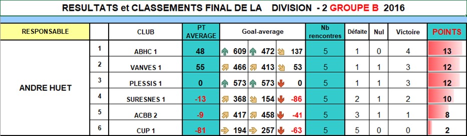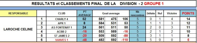 A l'issue des 5 rencontres, VANVES est 2ème de sa division, à 1 point de ABHC. VANVES sera donc toujours en 2ème division en 2017.
