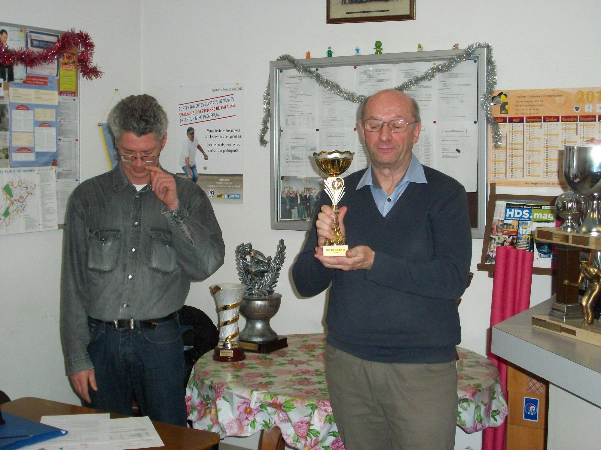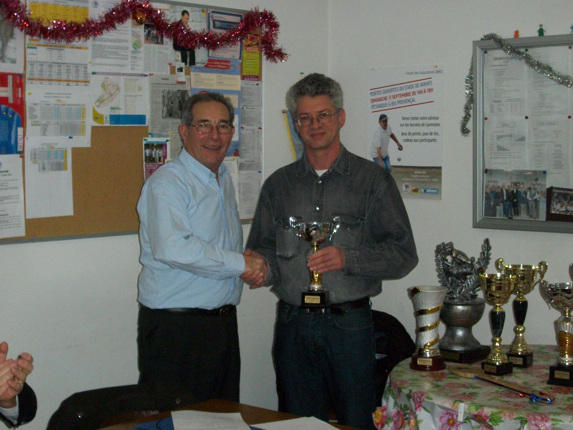 La remise des prix des tournois internes organisés en 2012 a été faite. Le concours « vétéran » a concerné 7 participants classés (sur 19 participants). Le 1er est Jacques Thoine et le 2ème Michel Desmolin. Les gagnants de la triplette mêlée (en mars) sont : 1er, Jacques Thoine, 2ème, Patrice Roussard et 3ème, Eric Boeuf. Les gagnants de la doublette mêlée (en octobre) sont : 1er, Patrice Roussard et 2ème Michel Desmolin. Le challenge Lapeyronie en tête à tête a été remporté par Pascal Diard.