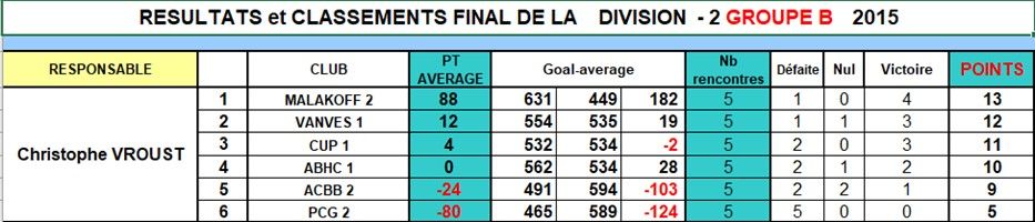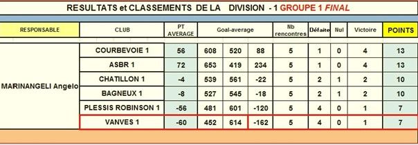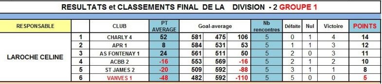 A l'issue des 5 rencontres, VANVES est 2ème de sa division, à 1 point de ABHC. VANVES sera donc toujours en 2ème division en 2017.