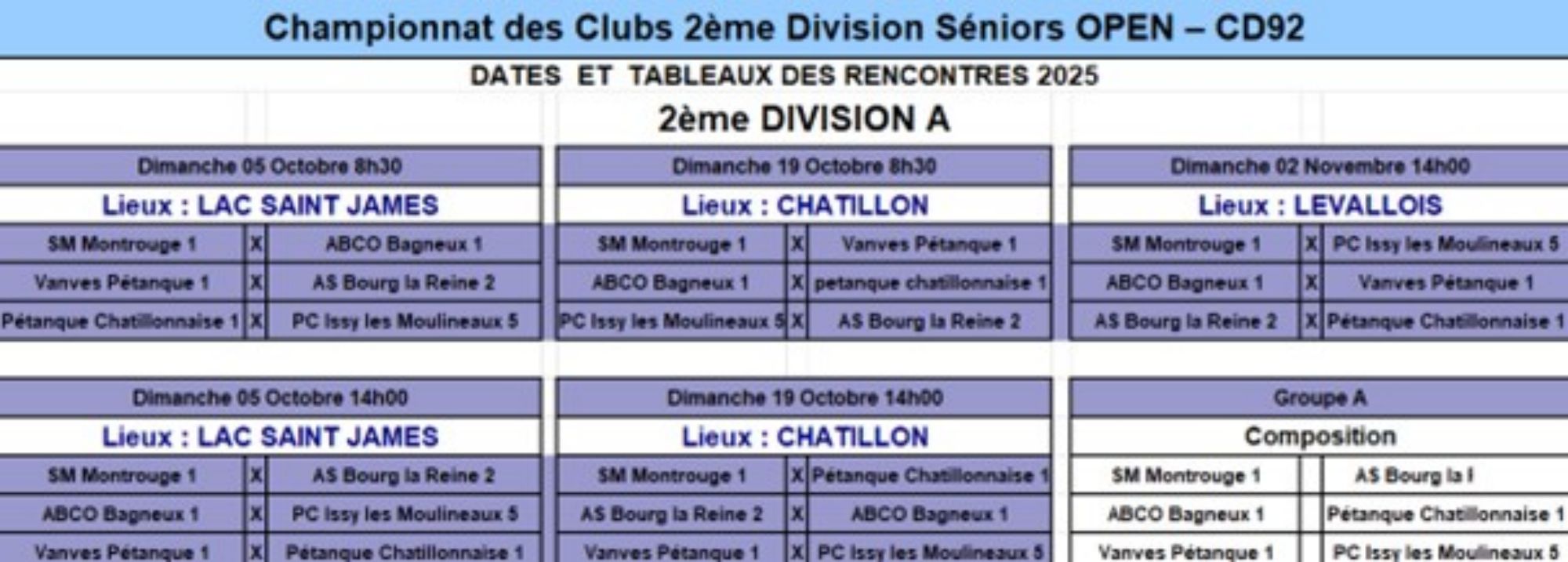 CDC 92 : Vanves (Eric, Patrice, Pascal, François, Michel, Cédric, Bruno et Cathy) a rencontré Bourg la Reine, le dimanche 5 octobre matin à Lac St James et Chatillon, l'après-midi. Une victoire et une défaite. Nous sommes 3ème ex-aequo.
