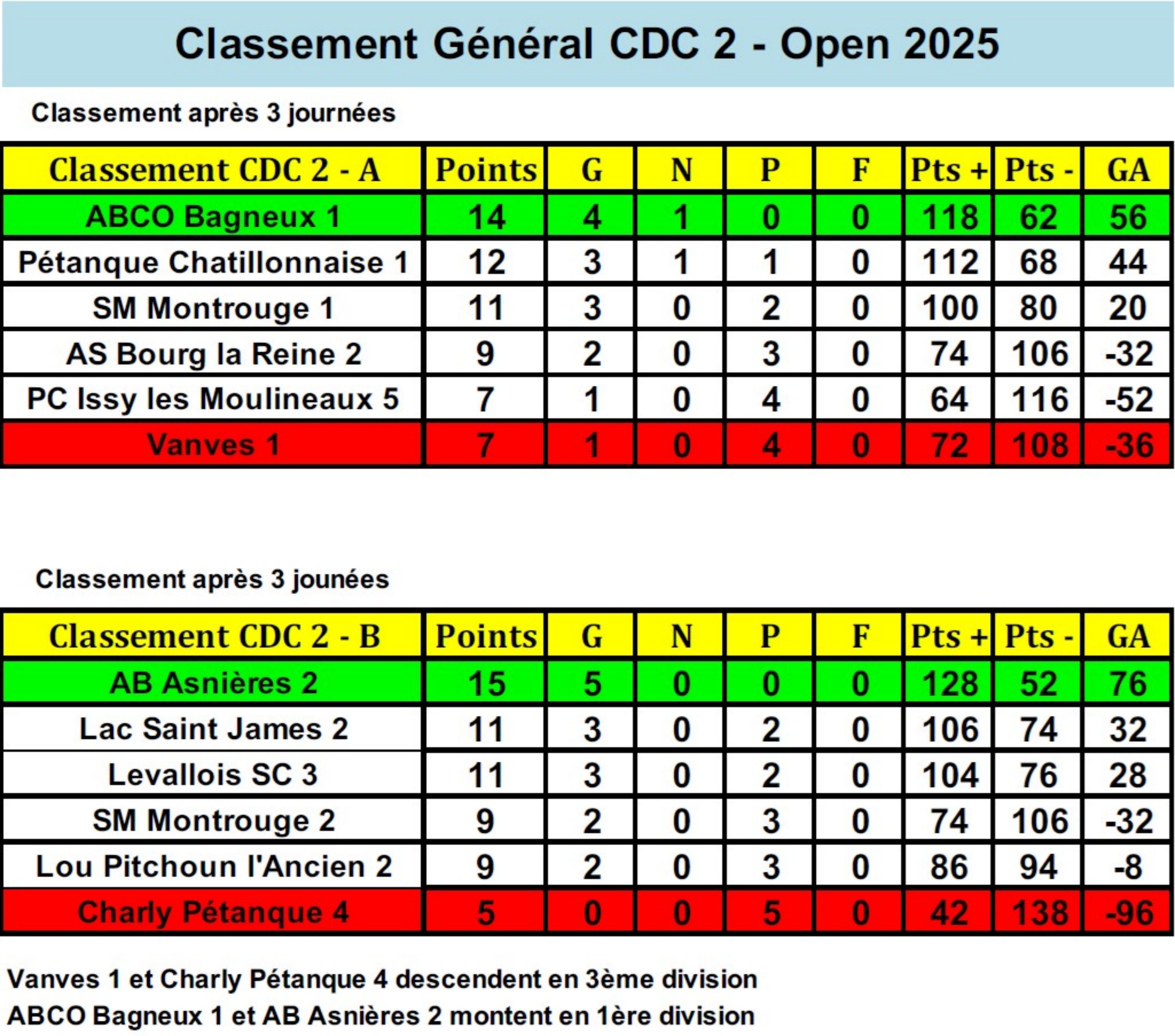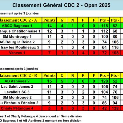 Vanves (François, Pascal, Michel, Bruno, Régis et Nathalie) a rencontré ABCO, le 2 novembre après-midi à Levallois. Vanves a perdu 8 à 28 (1 TàT et 1 triplette gagnés). Vanves descend en D3.